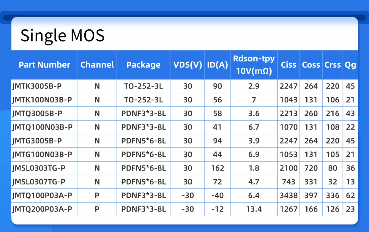 ? JMTK3005B-P/JMTK100N03B-P:采用Trench工藝,TO-252-3L封裝,30V/90A規(guī)格下Rds(on)僅2.9mΩ